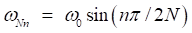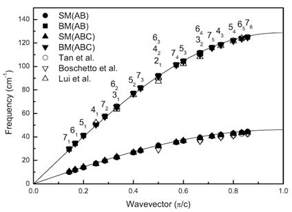 where the index n enumerates the vibrational modes, n = 1, 2 , …, N −1, ω0 is the optical phonon frequency of the infinite atomic chain with two-atom unit cell. The frequencies of the BMs and the SMs can be generated from the expression above by taking ω0 equal to the frequency of the BM and SM of graphite (Fig. 3). Figure 5 shows the graphs of the equation above for the BMs and SMs considering n/N as a continuous dimensionless wavevector in the range from zero to 1. The frequencies of the BMs and SMs, derived from the NTB calculations for AB- and ABC-stacked FLG, are given as solid symbols, while the available experimental data is plotted by empty symbols. It is clearly seen that the NTB frequencies, as well as the predictions of the equation above, are in excellent agreement with the experimental data, which supports the applicability of the used NTB model, as well as the simple mechanical model for the BMs and SMs. References: 1. V. N. Popov, New J. Phys. 6 (2004) 1-17. 2. V. N. Popov and L. Henrard, Phys. Rev. B 70 (2004) 115407. 3. V. N. Popov and Ch. van Alsenoy, Phys. Rev. B 90 (2014) 245429. 4. V. N. Popov, L. Henrard, and Ph. Lambin, Phys. Rev. B 72 (2005) 035436. 5. V. N. Popov and Ph. Lambin, Phys. Rev. B 73 (2006) 085407. |