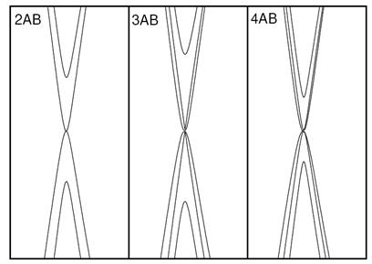 The electronic band structure of FLG is calculated within a non-orthogonal tight-binding (NTB) model with intralayer parameters, taken over from an ab-initio study (Porezag), and interlayer parameters, taken from another ab-initio study [3]. The phonon dispersion of FLG is calculated within the NTB model using a perturbative approach [4,5]. It has to be noted, that the ab-initio derived parameters account only for part of the electron-electron interactions and additional pair potential has to be introduced in order to obtain electronic band structure, which is in agreement with the ab-initio one. In the case of the interlayer interaction, the additional pair potential was derived by fitting to the breathing and shear modes, and to the cohesive energy of the graphene layers of AB-stacked graphite. Figure 2 shows a part of the electronic band structure of AB-stacked FLG in the energy region between −0.75 and +0.75 eV with respect to the Fermi energy, taken as zero, and in the vicinity of the K point of the Brillouin zone. The interlayer interaction lifts the degeneracy of the electronic bands, the splitting in the optical region of −1.5 to +1.5 being as large as 1 eV. Apart from the splitting, the electronic bands change their character in the vicinity of the Fermi energy. Namely, the two linear bands of graphene are modified to four parabolic bands for 2AB, two linear bands and 4 parabolic ones for 3AB, 6 parabolic bands for 4AB, etc. It has to be noted that the relative large splitting of the bands plays important role for transport and optical phenomena. Figure 3 shows the phonon dispersion of AB- and ABC-stacked graphite. The phonon branches of AB-stacked graphite along the ΓA direction are in excellent agreement with the available experimental data. It is clearly seen, that the interlayer interaction produces major modification only of the acoustic branches, while leaving the higher-frequency branches almost unchanged, apart from splitting up to a few cm-1 (Fig. 2, inset). Figure 4 shows the obtained low-frequency phonon dispersion of AB-stacked FLG. Apart from the acoustic branches with longitudinal (L), transverse (T), and out-of-plane (Z) character, denoted as LA, TA, and ZA, the interlayer interaction brings about additional optical phonon branches due to lifting of the N-fold degeneracy of the acoustic branches. In particular, N-layer AB-stacked graphene (or NAB graphene) has 3N – 3 additional optical branches, among which there are N – 1 LO branches, N – 1 TO branches, and N – 1 ZO branches. The ZO phonons have breathing-like displacement of the layers (breathing modes or BM), the LO+TO phonons have shear displacement of the layers (shear modes or SM). We note that the low-frequency phonon dispersion of N-layer ABC-stacked FLG is indistinguishable from that of AB-stacked FLG for the same number of layers (not shown here). The BMs and SMs have frequencies between zero and 126 cm-1, the latter frequency being the BM of AB-stacked graphite. The frequencies of the BMs and SMs can be derived by modeling FLG with any stacking as a linear N-atom molecule, consisting of equally separated identical atoms with nearest-neighbor interactions. It is straightforward to obtain the vibrational frequencies of the molecule as