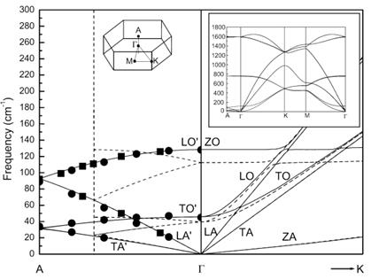 lines. The solid symbols are experimental data. Inset: phonon dispersion of