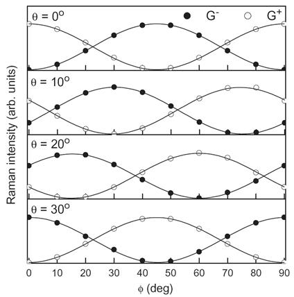G+ components of the G band (symbols) vs light polarization angle ϕ for parallel light