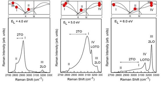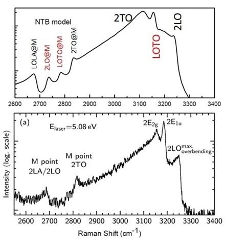 structure and phonon dispersion (Fig. 1), matrix elements In Ref. [6], we extended the calculation of the two-phonon bands to the ultraviolet region. Figure 2 shows the calculated Raman spectra of graphene at laser excitation EL = 4.0, 5.0, and 6.0 eV. The intense feature marked by 2TO is observed as a symmetric band at lower excitations and is referred to as the 2D band. At the studied high-energy excitations, this band widens and becomes asymmetric. The two end points of it, I and II, come from phonons along ΓK and KM, the corresponding processes being termed inner and outer. The feature II is enhanced for phonons close to the M point because of the high phonon density of states of the TO branch there. For this reason, it is denoted here by 2TO@M. Apart from the broad band 2TO, two other features can also be identified. The 2LO band comes from scattering by two LO phonons close to the Γ point. This peak is enhanced for phonons, close to the overbending of the LO band (panel at EL = 6.0 eV). Another feature, 2LOTO, can be seen as a sharp peak. It is a combination band, originating from the LO and TO branches, close to the Γ point. At lower Raman shifts, there are several other less intense peaks, denoted by LOLA@M, 2LO@M, and LOTO@M, which are also enhanced by the high phonon density of states at M. Figure 3 shows parts of the conduction (π*) and valence (π) bands in the vicinity of the M point of the Brillouin zone of graphene. Four different scattering paths of the electrons, marked by Latin numbers, can be identified. For laser excitation EL, close to 5.0 eV, the scattering of electrons takes place around the inflexion point of the electronic bands at the M point. The high electronic density of states there results in enhancement of the Raman intensity of the bands. Figure 4 shows that the calculated Raman spectrum at EL = 5.0 eV is in excellent agreement with the measured one (Tyborski, 2015). Additionally, the calculations allowed to assign precisely the features, marked in red. References: 1. V. N. Popov and L. Henrard, Phys. Rev. B 70 (2004) 115407. 2. V. N. Popov, L. Henrard, and Ph. Lambin, Phys. Rev. B 72 (2005) 035436. 3. V. N. Popov and Ph. Lambin, Phys. Rev. B 73 (2006) 085407 4. V. N. Popov and Ph. Lambin, Phys. Rev. B 74 (2006) 075415 5. V. N. Popov and Ph. Lambin, Eur. Phys. J. B 85 (2012) 418. 6. V. N. Popov and Ph. Lambin, 2D Materials 3 (2016) 025014. |
