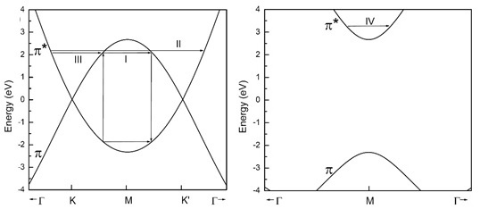 (π*) and valence (π) bands have inflexion point at M. The arrows