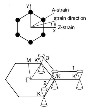 angle θ defines the strain direction. Right: Schematic of the conduction