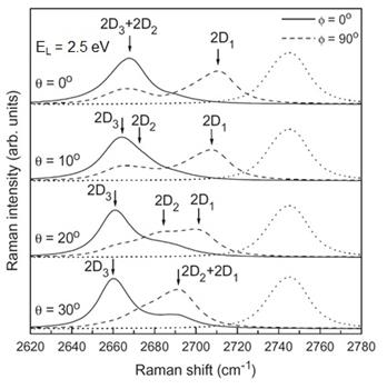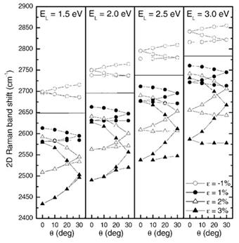the 2D band giving rise to a symmetric shape of this band. Here, we consider in-plane uniaxial strain at an angle θ with respect to a zigzag of carbon bonds [6]; θ varies from 0°, so called zigzag direction, to 30°, so-called armchair direction. In uniaxially strained graphene, the scattering paths 1, 2, and 3 in Fig. 1 are no longer equal and electrons are scattered by phonons with different wavevector and different frequency. Therefore, the 2D band generally comprises three subbands, denoted here as 2D1, 2D2, and 2D3, coming from scattering processes along the three paths. Figure 2 shows the calculated 2D band for tensile strain of 1% along different strain directions θ and for parallel light polarization along and perpendicular to the strain direction (polarization angle ϕ = 0° and 90°) at laser excitation EL = 2.5 eV. At θ = 0°, there are only two subbands 2D3 + 2D2, and 2D1; at 0° < θ < 30°, three subbands 2D1, 2D2, and 2D3 can be observed; at θ = 30°, only subbands 2D3 and 2D2 + 2D1 can be observed. The applied tensile strain results in red shifting of the Raman shift of the subbands. The splitting of the subbands is up to a few tens of cm-1. The derived overall splitting corresponds to the experimentally observed one, though mostly two subbands have been identified. Figure 3 shows the calculated Raman shifts [7]. They can be fitted nicely with the expressions [6]: