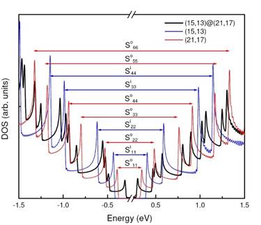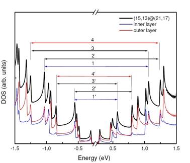 DOS of the non-interacting inner layer (15,13) (blue line) and outer layer (21,17) (red line). The horizontal arrows between the