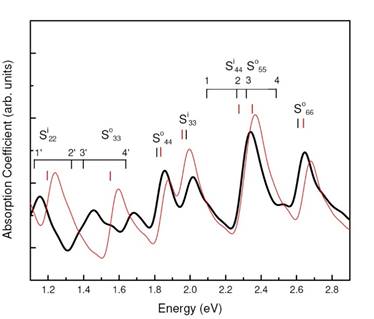 The double-walled carbon nanotube (DWNT) can be viewed as consisting of two coaxial cylindrical graphitic layers (Fig. 1). The separate layers have generally very large translational unit cells. The calculation of the electronic structure and phonon dispersion of the separate layer is facilitated by the use of the chiral symmetry of the layers, which allows to use a two-atom unit cell [1,2]. However, even though the separate layers of a DWNT have translational symmetry, their translational periods are generally incommensurate and the DWNT has no translational symmetry, which poses a major problem before the calculation of various properties of the DWNTs. It is important to address this problem because the interlayer interactions modify the electronic structure of the DWNT, resulting in measurable effects on the optical transitions, which can be shifted by tens of meV. The straightforward approach to solving the electronic structure problem for the DWNTs relies on the use of first-order quantum-mechanical perturbation theory to derive the interlayer interactions induced shift of the optical transitions. This, however, implies that such shifts are the only result of the interlayer interactions, which is not necessarily so. Here, we follow a different route, based on the use of the recursion method within a non-orthogonal tight-binding model with four orbitals per carbon atom to directly derive the electronic density of states (DOS) and optical absorption of the DWNTs [3]. This approach allows to predict not only shifts of the optical transitions but also appearance of new optical transitions in agreement with recent experimental data. The adopted approach is illustrated in the case of DWNT (15,13)@(21,17) (Fig. 1). A long piece of the DWNT of length 2000 A and number of orbitals 430000, is found sufficient for achieving convergence of the DOS. Similarly, a smaller piece of the DWNT of length 400 A and number of orbitals 86000 is found sufficient for convergence of the optical absorption. Figure 2 shows the DOS of the DWNT in comparison with the DOS of the non-interacting layers. It is clear that the DOS of the DWNT undergoes significant changes, most of the peaks being red- or blue-shifted with respect to those of the non-interacting layers. Since the number of spikes of the DOS of the DWNT corresponds to that of the non-interacting layers, it is tempting to derive the optical transitions of the DWNT as the separation between the mirror spikes of the DOS and adopt the same notation as for the non-interacting layers. However, the analysis bellow shows that this can lead to incorrect conclusions. Figure 3 shows the DOS of the DWNT in comparison with the contributions of the separate interacting layers. It is clear that most of the spikes of the DOS of the DWNT can be connected to one of the layers. However, four spikes, marked by vertical lines and connected by arrows 1 to 4, have non-negligible contribution from both layers, which can be interpreted as a significant mixing of the electronic states of the two layers. Thus, four transitions can be expected to appear because of the mixing of the states: two transitions 1 and 4 between mirror spikes, corresponding to transitions Si44 and So55 of the non-interacting layers, as well as two cross-band transitions 2 and 3. Similarly, large mixing of the electronic states is evident for the spikes, connected by arrows 1′ to 4′. Therefore, four transitions can be expected between these spikes: two transitions 1′ and 4′ between mirror spikes, corresponding to transitions Si22 and So33 of the non-interacting layers, aa well as two cross-band transitions 2′ and 3′. The evidenced mixing of the states of the layers alone does not allow to draw conclusions on the observability of the mentioned transitions, as the height of the absorption peaks will also depend on the interaction between the electronic states of the layers. Figure 4 shows the calculated optical absorption of the DWNT (black line) in comparison with that of the non-interacting layers (red line). It is clearly seen that the absorption spectrum of the DWNT differs significantly from that of the non-interacting layers in shape and number of peaks. As suggested above, four peaks (1 to 4) can be expected instead of the two peaks Si44 and So55 of the non-interacting layers. It is seen that at the energies of transitions 1 and 4 there is only a tiny kink and a small bump, while at the energies of the cross-band transitions 2 and 3 there is a high peak. Therefore, the cross-band transitions give major contribution to the absorption, while the mirror transitions give insignificant contributions. Similarly, transitions 1′ and 4′ give rise to smaller peaks that for the non-interacting layers, while the cross-band transitions 2′ and 3′ contribute to a wide peak. The obtained behavior of the absorption peaks can be explained by simple arguments, provided by the quantum-mechanical perturbation theory [3]. Simple expressions, allowing to evaluate the height of the peaks of the DWNT for a given difference of the optical transitions of the inner and outer layer, and interaction matrix element, are derived [3]. In conclusion, using the recursion method within a non-orthogonal tight-binding model, we show that the interaction between the layers of a DWNT can give rise to major changes of the electronic structure of the DWNT, such as mixing of the electronic states of the two layers, shift of the optical transitions as well as appearance of new transitions, which is evidenced here for the first time. Strong mixing of the states can be expected if the two layers have close optical transitions and there is a strong interaction between the states of the two layers (e.g., Si44 and So55). Significant mixing of the electronic states can be expected even for relatively large difference of the transition energies of the layers (e.g., Si22 and So33), which can result in absorption peaks of the cross-